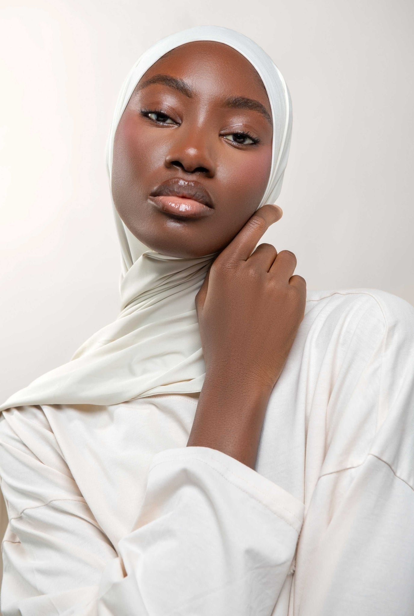 Le voile Greige est facile à utiliser et se porte sans nécessiter de bonnet en dessous. Sa matière gainante garantit qu'il reste bien en place sans glisser.