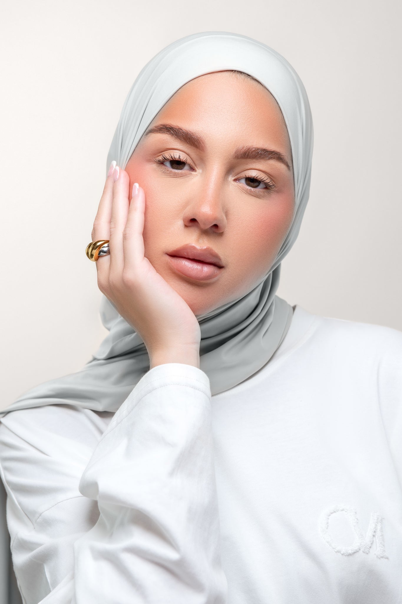 Le voile Greige est facile à utiliser et se porte sans nécessiter de bonnet en dessous. Sa matière gainante garantit qu'il reste bien en place sans glisser.