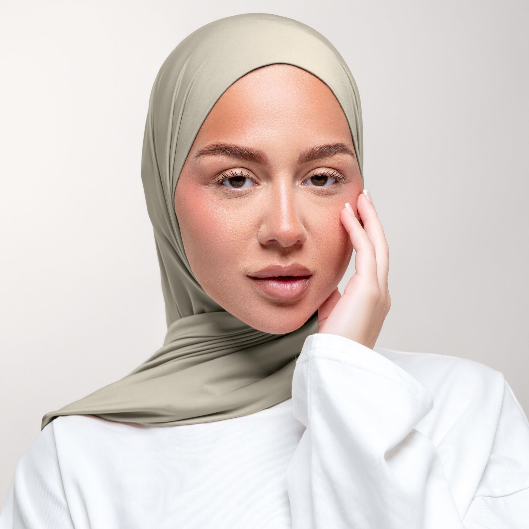 Le voile Greige est facile à utiliser et se porte sans nécessiter de bonnet en dessous. Sa matière gainante garantit qu'il reste bien en place sans glisser.
